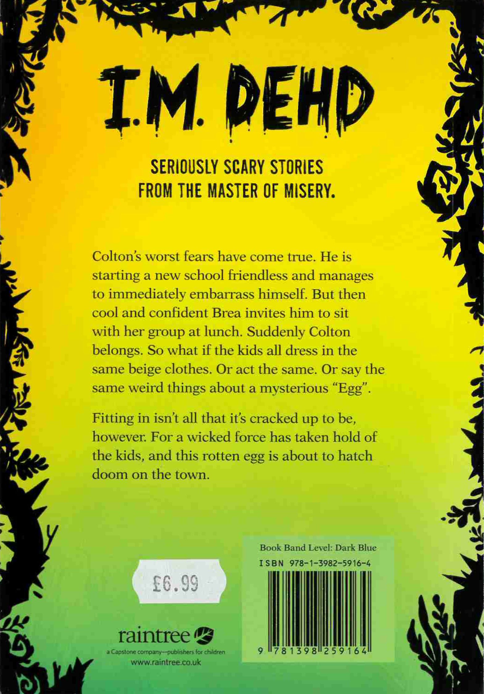 Colton’s worst fears have come true. He’s starting middle school friendless and immediately manages to totally embarrass himself. But then Brea invites him to sit with her at lunch. The girl is so nice and sure of herself. He eagerly joins her growing crew. So what if the kids all dress in the same boring beige clothes. Or act the same. Or say the same weird things about a mysterious “Egg.” (Not to mention that adults have been vanishing since school began.) When Brea brings Colton to her house to fully recruit him into her circle, though, he’ll learn fitting in isn’t all that it’s cracked up to be. For an extraterrestrial evil is nesting inside, and this rotten egg is about to hatch doom on the entire town. Prepared to be scared in this chilling chapter book for young readers by the master of misery and fright, I.M. Dehd.